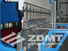 本系列液壓折彎機是雙缸上動式的數(shù)控液壓折彎機,它通過伺服比例閥上的各類閥門動作來驅動左右油缸的伸長與返回,從而帶動滑塊的上升與下降?;瑝K的同步采用全閉環(huán)電液伺服控制技術,滑塊位置信號由兩側光柵尺反饋給數(shù)控系統(tǒng),再由數(shù)控系統(tǒng)控制同步閥的開口大小,自動調(diào)節(jié)油缸進油量的多少,從而控制滑塊(Y1、Y2)軸的同步運行,始終保持對工作臺的平行狀態(tài)。