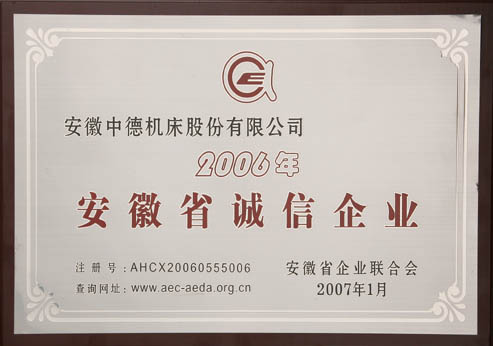近日我公司被安徽省企業(yè)聯(lián)合會(huì)評(píng)為2006年“安徽省誠(chéng)信企業(yè)”。