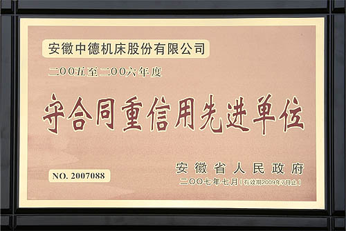 近日,安徽中德機(jī)床股份有限公司被安徽省人民政府授予2005-2006年度“守合同重信用先進(jìn)單位”這一稱號。這也是我公司繼由馬鞍山市工商局、市人民政府、省工商局多次授予此類稱號后,再次獲得的更高級別的榮譽(yù)。