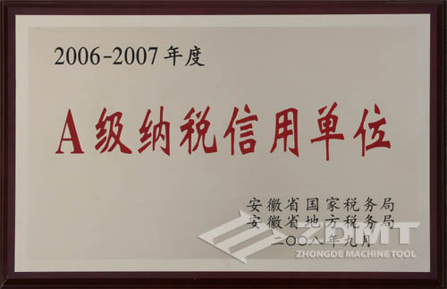 近日,安徽省國(guó)家稅務(wù)局、地方稅務(wù)局聯(lián)合表彰了2006-2007年度納稅信用等級(jí)A級(jí)納稅人,中德機(jī)床也再次被授予了“A級(jí)納稅信用單位”的證書(shū)。